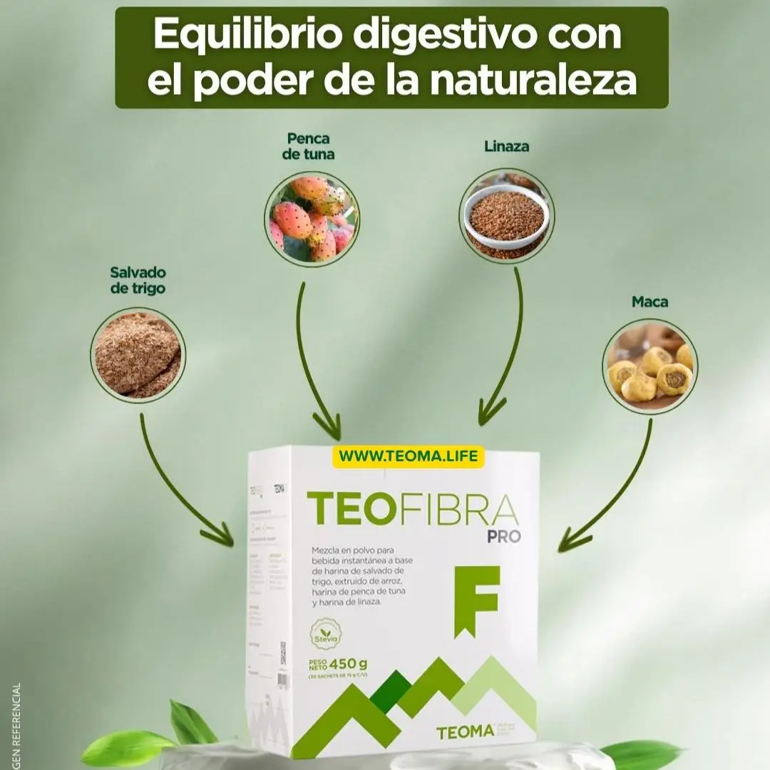 TEO FIBRA PRO, es un complemento natural que activará al máximo tu salud, haciendo que te veas mas joven y radiante.  Contiene una fórmula completa a base de fibra de penca de tuna, soya, maracuyá, sacha inchi, linaza, quinua, kiwicha, arroz y salvado de trigo. Además tiene probióticos y vitaminas que limpiarán, purificarán, protegerán y nutrirán tu tracto digestivo haciendo que utilices mejor los nutrientes de los alimentos.